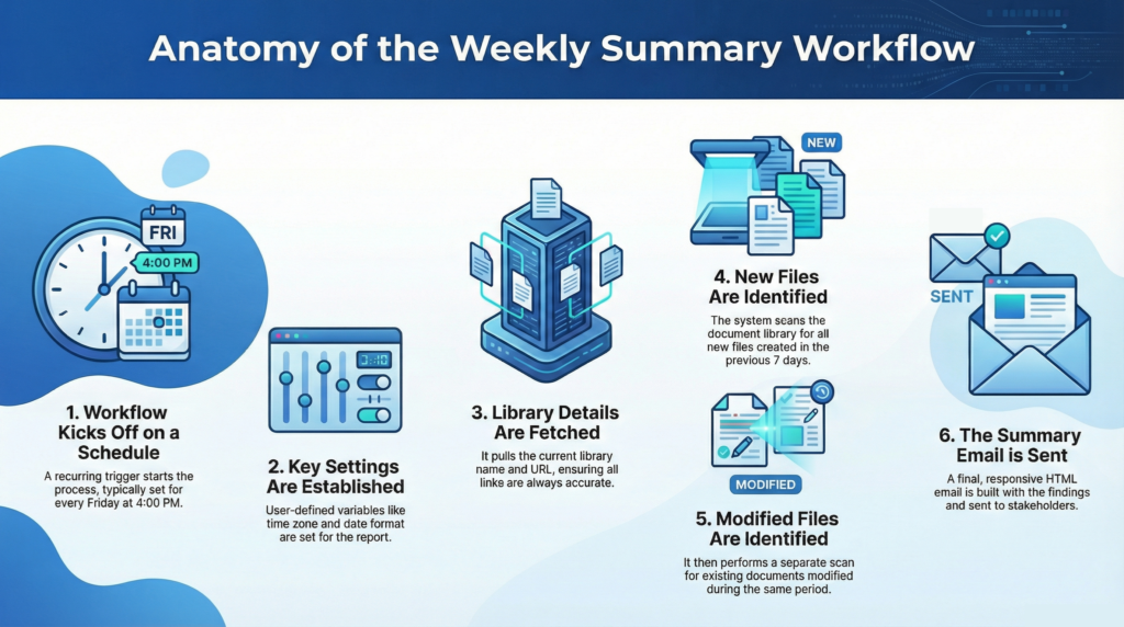 Perfect for Friday afternoons, this flow summarizes all weekly activities. It keeps stakeholders informed without requiring real-time monitoring of the library.