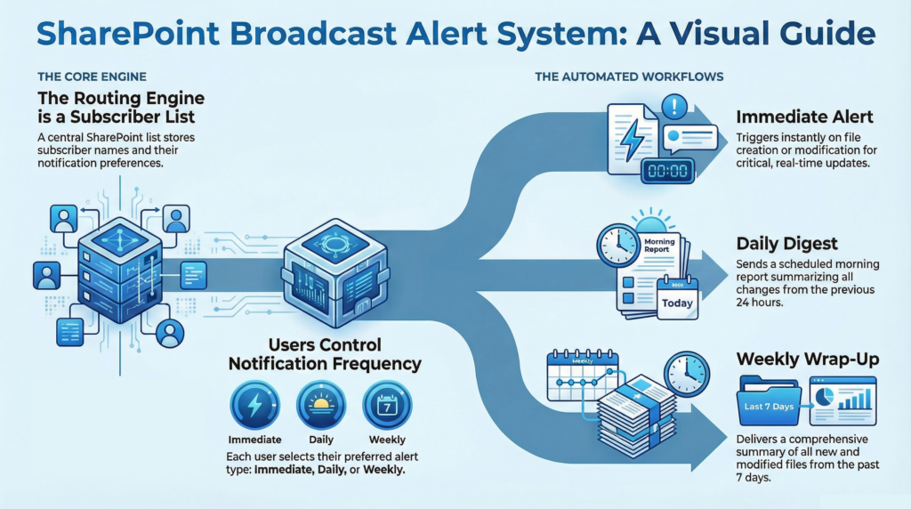 - SharePoint Alert Replacement Decision Matrix: Offers a logical path for choosing between simple Rules and advanced Flows.